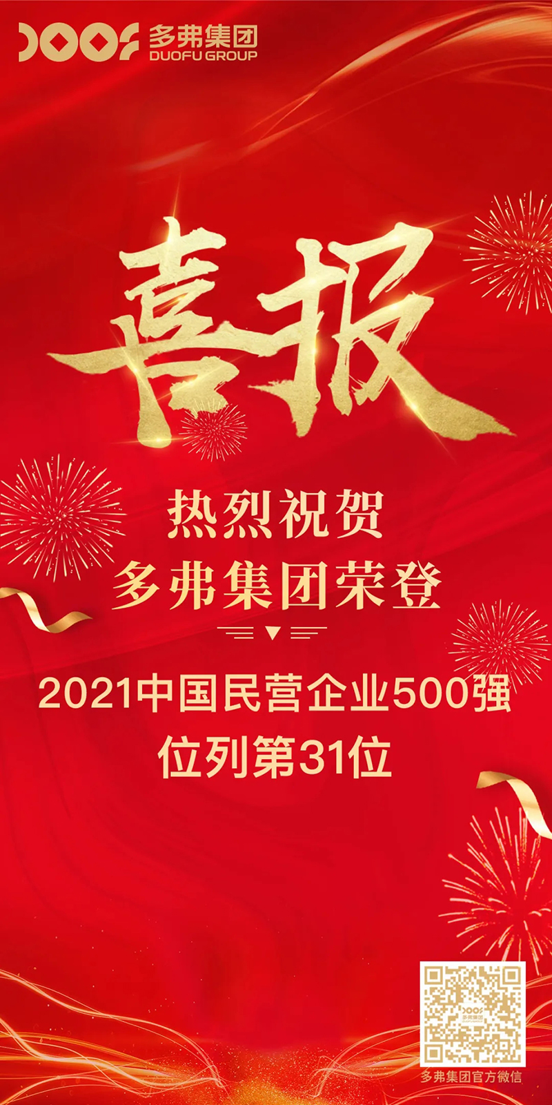 多弗集團董事長胡興榮先生表示,多弗集團多年蟬聯(lián)“中國民營企業(yè)500強”、此次又登榜“2021中國企業(yè)500強”及“2021中國制造業(yè)企業(yè)500強”,這既是各界對多弗集團的勉勵,也是鞭策多弗集團前進的不竭動力。未來,多弗集團將繼續(xù)砥礪奮進,全力謀發(fā)展。強化使命擔當,堅持創(chuàng)新變革,努力培育新優(yōu)勢,不斷提高發(fā)展質(zhì)量和水平,努力成為推動中國經(jīng)濟社會發(fā)展的新動力。