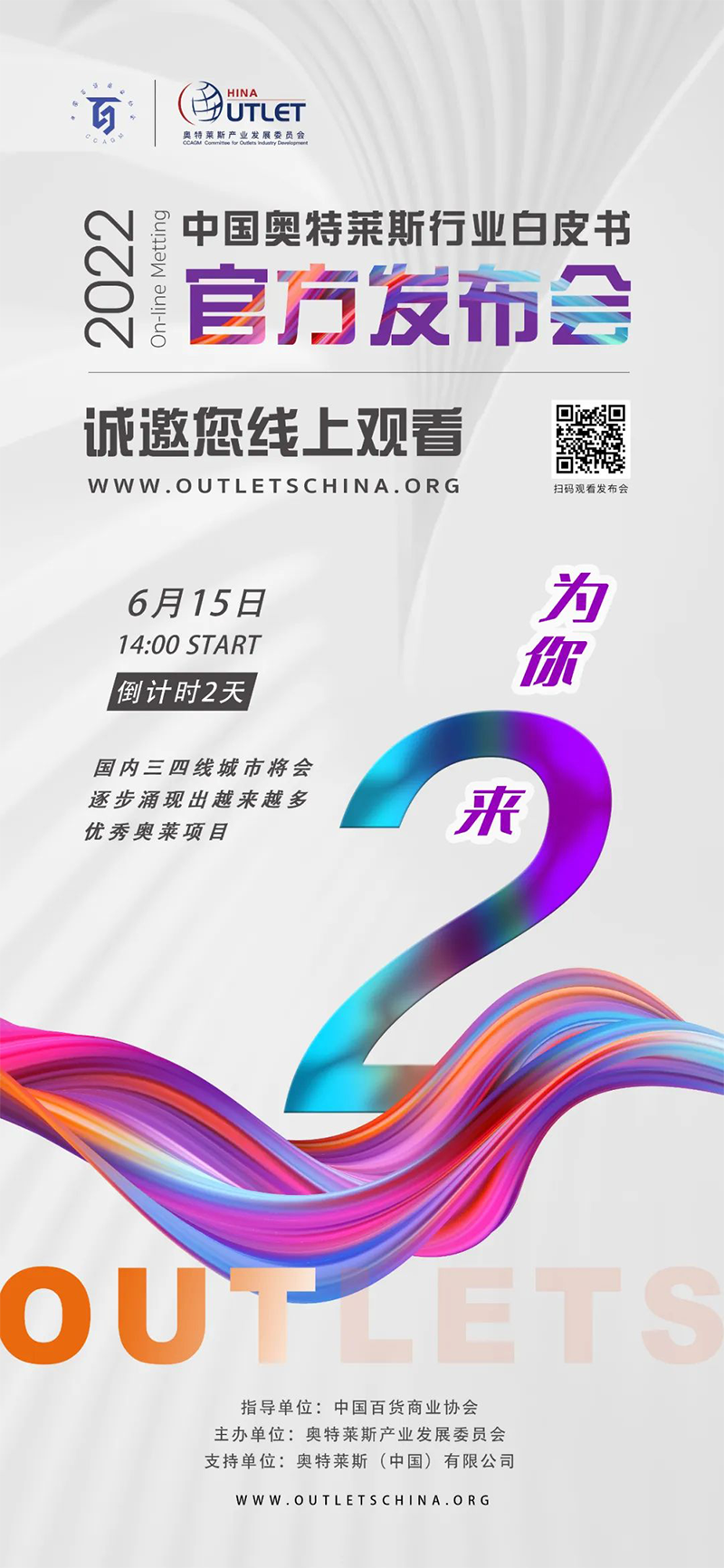 2022年6月15日14:00,《2022年中國奧特萊斯行業(yè)白皮書》線上發(fā)布會即將正式開始,本次發(fā)布會,將對國內(nèi)零售市場及奧萊產(chǎn)業(yè)引入中國20年發(fā)展的經(jīng)驗及機遇做出全新解讀。
