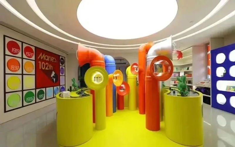 Mamǎfufú將“小紅閑”這一概念發(fā)揮得淋漓盡致,無論是整體的場景風(fēng)格,對于色彩的靈活運用,還是互動體驗的內(nèi)容和品牌首店引入,都創(chuàng)造了極高的出片效果,吸引眾多年輕人前來打卡消費。Mamǎfufú超級百貨是一個跨界聯(lián)合的潮流文創(chuàng)空間,占據(jù)了M+馬利位置最好的沿街二樓,無論室外的墻體,還是室內(nèi)的布置,均大面積運用了極具張力的紅黃藍(lán)三原色,將“馬利”這個百年顏料品牌的“色彩主義”貫穿于整體空間設(shè)計中。1000㎡的空間內(nèi)營造了8個主題區(qū)域,設(shè)置馬利趣味工廠、馬利畫材、POP-UP Market、色彩理想國、靈感書集、色彩生活集市、色彩沙龍等主題區(qū)域,涵蓋藝術(shù)展覽、手工工作室、畫材、圖書、生活家居、藝術(shù)衍生、服裝零售等多種業(yè)態(tài)內(nèi)容。