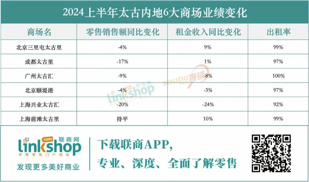 針對中國內(nèi)地市場,太古地產(chǎn)的零售物業(yè)在上半年表現(xiàn)出一定的分化趨勢。盡管整體零售銷售額實現(xiàn)了4%的同比增長,但具體到各個商場項目時,可以發(fā)現(xiàn)高端商場與綜合類商場之間存在明顯差異。高端商場普遍面臨銷售下滑的挑戰(zhàn),而綜合類商場則相對保持了穩(wěn)定。
