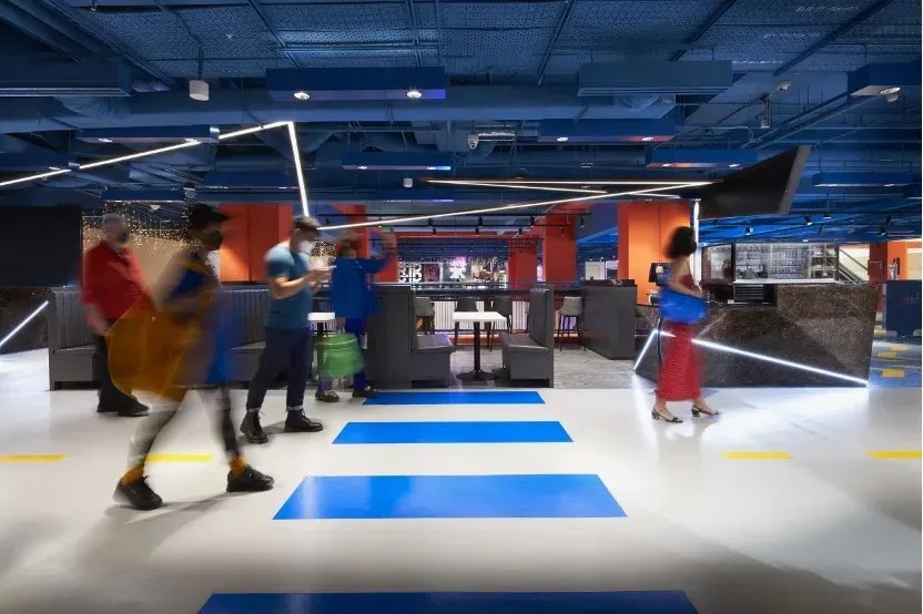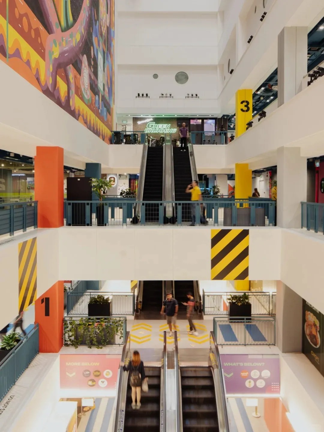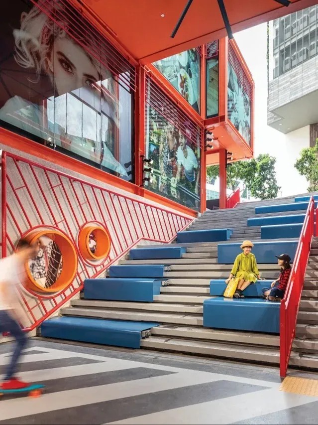 在空間優(yōu)化上,GRiD項目著重打造社交與活躍氛圍。通過引入“社交樓梯”理念,將傳統(tǒng)商鋪空間轉(zhuǎn)變?yōu)榧蓍e、交流與體驗于一體的多元功能區(qū)。這些設(shè)計不僅增強了建筑的視覺吸引力和可識別性,還以鮮明的橙色、藍色及白色調(diào),為空間注入活力與現(xiàn)代感,使其在城市街角中獨樹一幟。