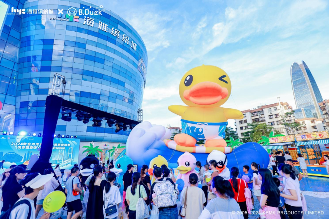 時值暑期,深圳海雅繽紛城邀請B.Duck品牌創(chuàng)辦人“鴨爸爸”許夏林,以及市/區(qū)商務(wù)局、中山商務(wù)局、新安街道辦、市零售商業(yè)行業(yè)協(xié)會等官方代表,共同開啟了2024黃金內(nèi)灣消費(fèi)季暨暑期促消費(fèi)——悅享盛夏嗨Ya狂歡購系列活動的序幕,成功完成中國第一自主IP B.DUCK小黃鴨的“B.DUCK嗨YA狂歡節(jié)全國首展”。