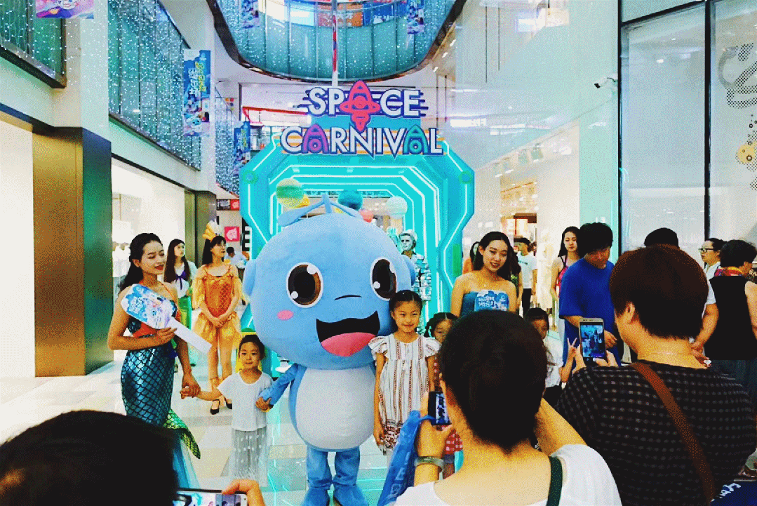 對于城市而言,天津作為海濱城市,海洋元素的小鯨魚IP衍生也是在地文化內(nèi)容發(fā)酵的重要一環(huán)。原創(chuàng)主題IP“鯨仔”作為天津第一個購物中心主題IP,擬人化形象助力品牌傳播,通過鯨仔IP的逐步成長,在地文化也將植入這種符號化、人格化的形象,塑造了多場商業(yè)美陳、平面延展、在線客服、抖音網(wǎng)紅、巡游快閃等活動,把商業(yè)和精神消費相融合,快速匯聚人氣,打開城市發(fā)展的認(rèn)知度、文化力和性格定位。
