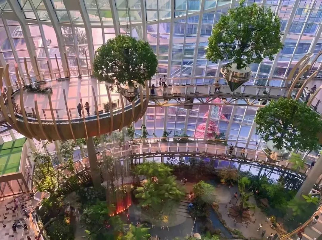 購物中心引入綠色自然的戶外空間和各類健康運(yùn)動的活動,不失為一種常見策略。如重慶光環(huán)購物公園通過生態(tài)綠植、以綠色填充商業(yè)公共空間,給年輕人營造一種仿若森林的美感,混合著泥土氣息的自然美感撲面而來,呈現(xiàn)一處城市生態(tài)綠洲。