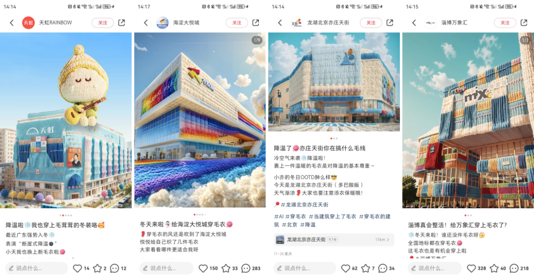 還記得今年冬天那些“穿毛衣”的購物中心嗎?首先發(fā)布的一波AI制圖“購物中心穿毛衣”海報,確實有些以假亂真,讓很多消費者看到了一群可可愛愛的商場。這些購物中心將主形象通過“穿毛衣”這一事件變得更加擬人化,靠不同的“穿搭風格”烘起線上平臺的話題討論熱度,也讓消費者看到了官方的親近與真誠。