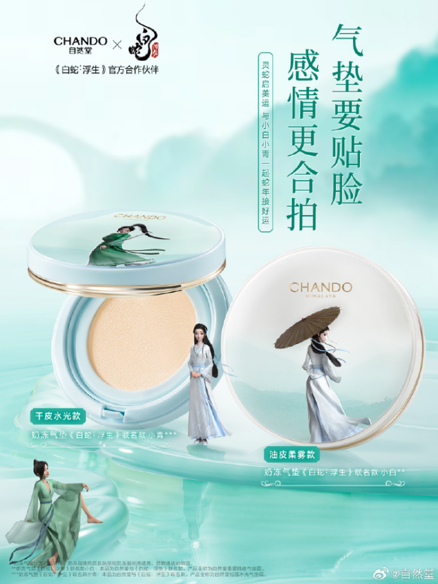 在2024年,《白蛇3:浮生》不僅打破了七夕檔期動畫電影的累計票房紀(jì)錄,而且白蛇IP還借此機會與金石盟珠寶、北京一卡通、YHD羊很大、芬蘭珠寶FEO等眾多品牌合作推出聯(lián)名產(chǎn)品。隨著蛇年營銷活動的啟動,《白蛇3:浮生》迎來了聯(lián)名產(chǎn)品的“第二春”。自然堂與《白蛇3:浮生》的聯(lián)名款氣墊推出后,緊接著“自然堂蛇年生肖禮盒”也相繼問世。