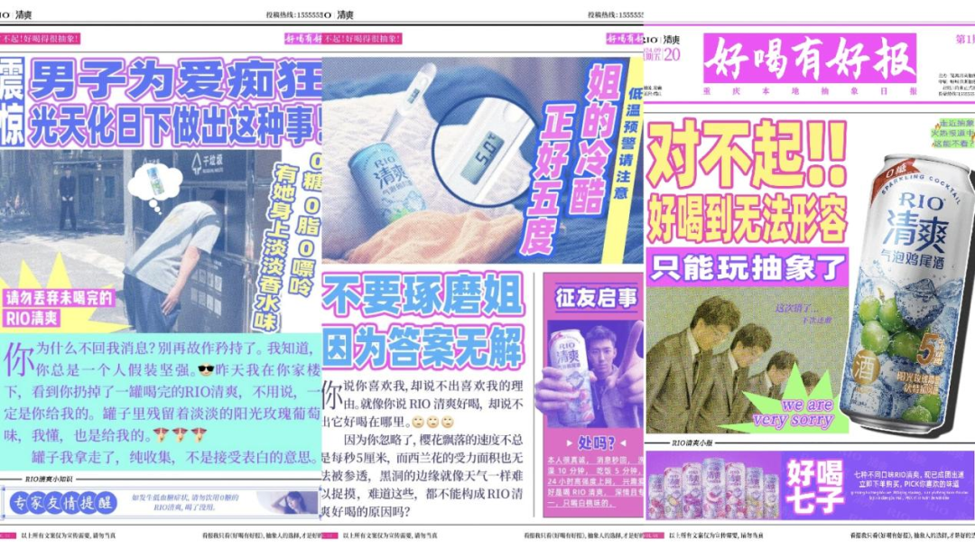 比如在五一調(diào)休這個社會熱點話題中,RIO雞尾酒請出了大IP林黛玉,推出一組“我在人間黛醉上班”的海報,每一句都非常“有那味兒”。這組海報以林黛玉的形象為核心,將她的古典韻味與現(xiàn)代職場生活巧妙融合,每一幅都充滿了獨特的韻味與深意。
