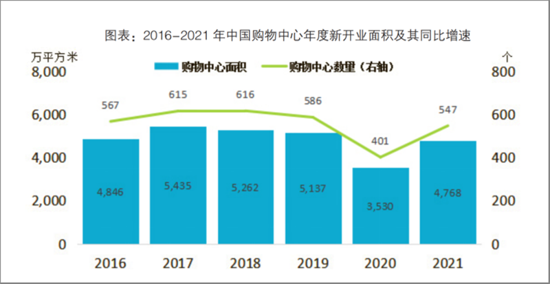 《白皮書》在“2021年中國(guó)零售市場(chǎng)最新發(fā)展”部分指出,2021年,中國(guó)實(shí)現(xiàn)GDP(國(guó)內(nèi)生產(chǎn)總值)114.4萬(wàn)億元,穩(wěn)居全球第二大經(jīng)濟(jì)體,全年社會(huì)消費(fèi)品零售總額達(dá)到44.1萬(wàn)億元,同比增長(zhǎng)12.5%。同時(shí),中國(guó)在運(yùn)營(yíng)購(gòu)物中心數(shù)量達(dá)到6387個(gè),總面積達(dá)到4.75億平方米。其中,2021年新開業(yè)購(gòu)物中心數(shù)量為547個(gè),總面積為4768萬(wàn)平方米。中國(guó)“購(gòu)物中心年新開業(yè)面積/在運(yùn)營(yíng)面積”比例持續(xù)下降,2021年年末降至0.1。中國(guó)已經(jīng)進(jìn)入購(gòu)物中心存量時(shí)代。